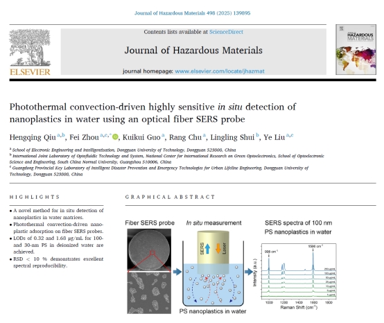 近日,我校刘晔教授团队发展了一种新型的基于拉曼光谱的水中纳米塑料高灵敏、原位检测方法,相关成果以“Photothermal convection-driven highly sensitive in situ detection of nanoplastics in water using an optical fiber SERS probe”为题,发表在环境科学领域一区TOP期刊Journal of Hazardous Materials。东莞理工学院为论文第一完成单位,研究生邱恒清为论文第一作者,周飞副研究员为通讯作者。