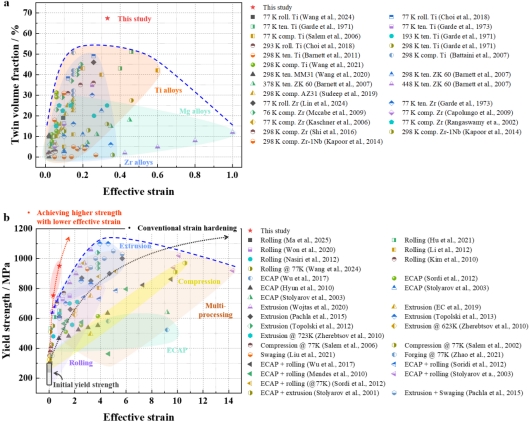 密排六方(HCP)结构的工业纯钛由于轻质、高比强度和高耐蚀性,在低空经济、生物医疗、化工能源等新兴关键领域具有广泛的应用前景。为了进一步提高纯钛的承载能力、突破其力学性能瓶颈,本工作创新性地提出了“织构调控与深冷变形”的协同加工策略,通过变形孪晶的选择性激活,在钛中构筑孪晶体积分数高达67 %的多级孪晶结构,结合孪晶强化和位错强化等多重强化机制,将材料的强度提升至1 GPa以上。本工作不仅系统阐明了晶体取向和变形温度耦合效应对HCP材料中孪晶系选择性激活的作用机理,澄清了不同孪晶系的温度敏感性差异及其调控准则,而且开发了新型的金属结构材料构效关系调控制度,通过引入较低的等效应变(约0.33)即可实现高密度多级孪晶结构的定向构筑和承载能力的显著提升,满足高效、节能、可放大、易推广的工程化应用需求。