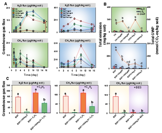 黑水虻堆肥是一种兼具减量化、资源化与高值化潜力的新型污泥处理技术,但其处理过程中可能产生氧化亚氮(N₂O)和甲烷(CH₄)等温室气体,影响绿色低碳应用效果。与此同时,银纳米颗粒广泛应用于医药、化妆品和水处理等领域,进入污水处理系统后多以硫化银纳米颗粒(Ag₂S-NPs)形式富集于污泥中,其在黑水虻堆肥过程中的环境行为及生态效应尚不清楚。针对上述问题,研究团队构建了含银/硫化银纳米颗粒污泥的黑水虻堆肥体系,结合温室气体通量监测、功能基因定量、宏基因组分析及同步辐射表征等手段,系统揭示了银形态转化及其对温室气体排放的影响机制。研究结果表明,黑水虻会增加污泥堆肥过程中N₂O和CH₄排放,而添加Ag-NPs或Ag₂S-NPs后可显著抑制两类温室气体释放。在黑水虻存在条件下,Ag/Ag₂S-NPs使N₂O排放降低51.7%–86.1%,CH₄排放降低44.3%–92.9%,全球增温潜势显著下降。机理分析表明,N₂O减排主要与hao、norB等功能基因受抑及nosZ基因增强有关;CH₄减排则主要与mcrA受抑和pmoA增强有关。进一步研究发现,Ag₂S-NPs在黑水虻肠道中部分转化为AgCl,且生物有效性增强,从而重塑肠道微生物群落并抑制反硝化和产甲烷代谢过程。该研究阐明了含银污泥在黑水虻堆肥过程中的温室气体减排机制,为污泥低碳资源化利用和新污染物风险管理提供了理论依据。