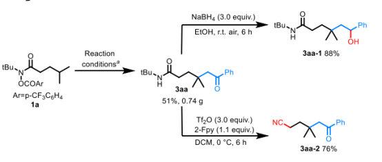 在此项工作中,王晓季教授团队开发了一种全新且绿色的光氧化还原催化策略。该工作巧妙利用了可见光催化与 1,5-氢原子转移(1,5-HAT),并以二甲基亚砜(DMSO)作为反应介质促进原位级联反应,成功实现了原本惰性的脂肪族酰胺γ-位 C(sp³)-H键的精准活化与转化。这一方法不仅条件温和,N-叔丁基取代的酰胺可以在温和条件下转化为氰基化合物,方便其进一步官能团化。