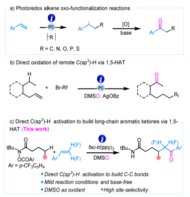 长链芳基酮是一类重要的有机化合物,兼具芳香体系与羰基官能团的结构特点,赋予其良好的结构稳定性与多样的反应活性。这类骨架广泛存在于天然产物、药物分子及功能材料中。此外,酮羰基可作为进一步官能化的有效位点,用于构筑复杂分子结构。传统的长链芳基酮合成方法包括Friedel-Crafts酰基化、一氧化碳插入、醇氧化及烯烃氧官能化等。然而,这些方法往往依赖预官能化底物、强路易斯酸或当量金属试剂,限制了官能团耐受性与操作简便性。近年来,光催化烯烃氧官能化策略被发展为合成芳基酮的有效工具,以DMSO作为终端氧化剂。但这些方法普遍依赖活化烯烃来稳定碳正离子中间体并促进Kornblum型氧化,且需要当量外源碱来终止氧化步骤,带来成本与环境负担。另一方面,基于分子内1,5-氢原子转移(1,5-HAT)的远程官能化策略近年来受到广泛关注。例如,马艳娜课题组报道了通过1,5-HAT过程实现1,6-氟烷基酮的直接合成,但仍依赖苯甲酸银(AgOBz)作为自由基引发剂与碱,在环境友好性与成本效益方面存在提升空间。