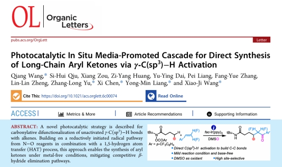 3月,我校松山湖医工融合创新中心、化学工程与能源技术学院王晓季教授团队在有机化学TOP期刊《Organic Letters》上在线发表题为Photocatalytic in-situ media-promoted cascade for direct synthesis of long-chain aryl ketones via γ-C(sp³)-H activation的最新研究成果。化学工程能源与技术学院青年教师王强博士为论文的第一作者,我校2022级应用化学卓越班本科生丘思慧同学为该论文的第二作者(即学生第一作者)。东莞理工学院为论文的第一单位。