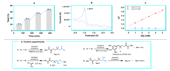 为探究反应路径,进行了系列实验。光开关实验表明,无光照时反应完全停止(图3a)。循环伏安与荧光淬灭实验证实,激发态光催化剂被底物1a氧化淬灭,从而启动反应,而烯烃2a无此作用(图3b, 3c)。自由基捕获剂(TEMPO、BHT)可几乎完全抑制反应,并检测到自由基加合物生成;此外,加入1,1-二苯基乙烯后同时得到自由基衍生产物与目标产物。这些结果均支持反应经历自由基途径(图3d, 1−3)。对照实验排除了产物由醇中间体转化而来的可能(图3d, 4)。