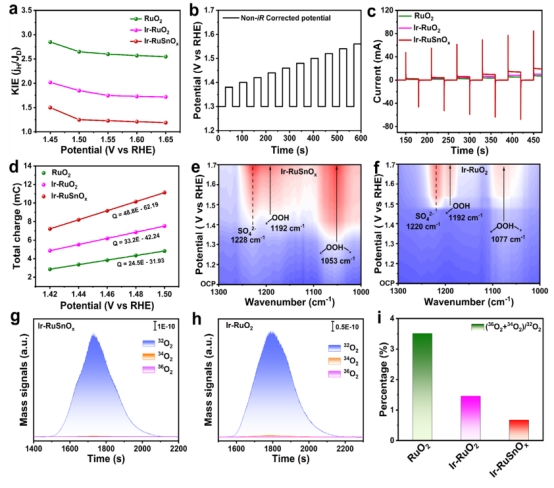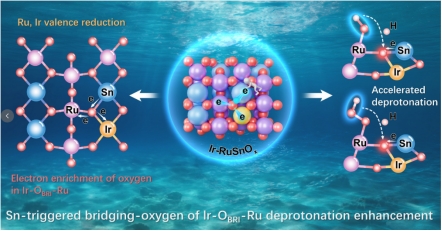 通过结合电化学测试与理论计算,团队揭示了一种全新的反应机制:锡(Sn)作为强电子供体,增强了Ir-O-Ru motif中桥氧(Obri)的电子局域化能力。这使得桥氧能够作为质子受体,促进Ru位点上O-H和OO-H物种的去质子化过程,形成Obri-H中间体。这一机制有效降低了决速步(RDS)的能垒,加速了OER动力学。同时,Sn的引入增加了Ir-O-Ru结构的电子密度,增强了其抗氧化降解的能力,从而实现了活性与稳定性的双重提升。