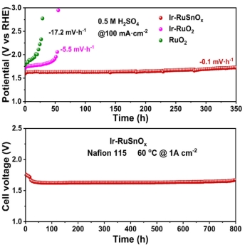 实验数据显示,该新型催化剂在酸性条件下表现出优异的电催化性能:其在10 mA cm-2电流密度下的过电位低至165 mV,并在100 mA cm-2条件下稳定运行超过350小时;进一步的实际器件验证表明,集成该催化剂的PEMWE系统能在1 A cm-2的大电流密度下连续运行800小时而无明显衰减,展现了良好的工业化应用前景。