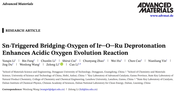 2月,东莞理工学院材料科学与工程学院汪文龙研究员团队联合兰州大学、中国科学院大连化学物理研究所等科研单位,在酸性析氧反应(OER)电催化剂领域取得重要突破。研究人员成功开发了一种新型三元氧化物催化剂(Ir-RuSnOx),显著提升了质子交换膜水电解(PEMWE)技术的效率与稳定性。相关研究成果以"Sn-Triggered Bridging-Oxygen of Ir-O-Ru Deprotonation Enhances Acidic Oxygen Evolution Reaction"为题,发表在材料科学顶级期刊《先进材料》(Advanced Materials)上。论文以东莞理工学院为第一完成单位,兰州大学、中国科学院大连化学物理研究所等为合作单位。博士后李彦琴、方彬博士为论文共同第一作者,汪文龙研究员、李泽龙研究员为通讯作者;中国科学院大连化学物理研究所李灿院士指导研究工作。
