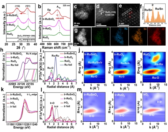针对上述挑战,研究团队设计并合成了一种原子级分散的Ir取代表面Ru位点的三元氧化物催化剂Ir-RuSnOx,构建了独特的Ir-O-Ru原子界面。